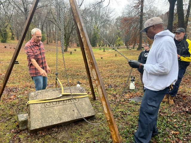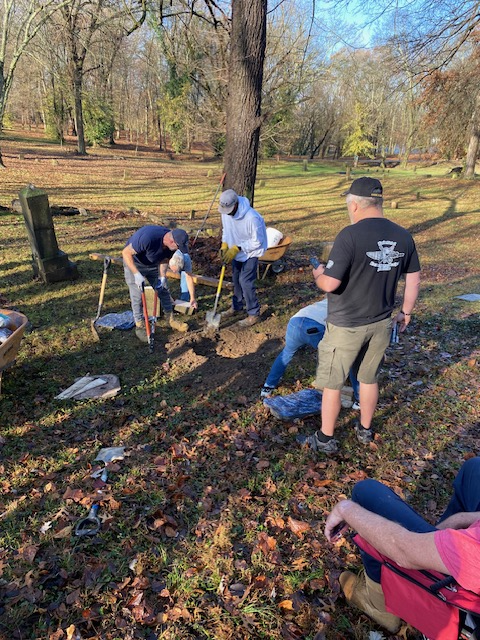 Calvin F. Johnson family plot- Odd Fellows Cemetery (Knoxville, TN)Tablet headstone marker- Odd Fellows Cemetery (Knoxville, TN)President Michael Woods resetting a monument with a 9′ tripodPresident Michael Woods using a tripod to reset a 600lb monument 48 State Tour VehicleMonument reset complete- Odd Fellows Cemetery (Knoxville, TN)Jonathan Appell inspecting an unsafe, cracked monumentBroken monument after assessment- Odd Fellows Cemetery (Knoxville, TN)Workshop participants digging out a monument base (President Woods pictured)Workshop participants digging out a monument base (another angle)